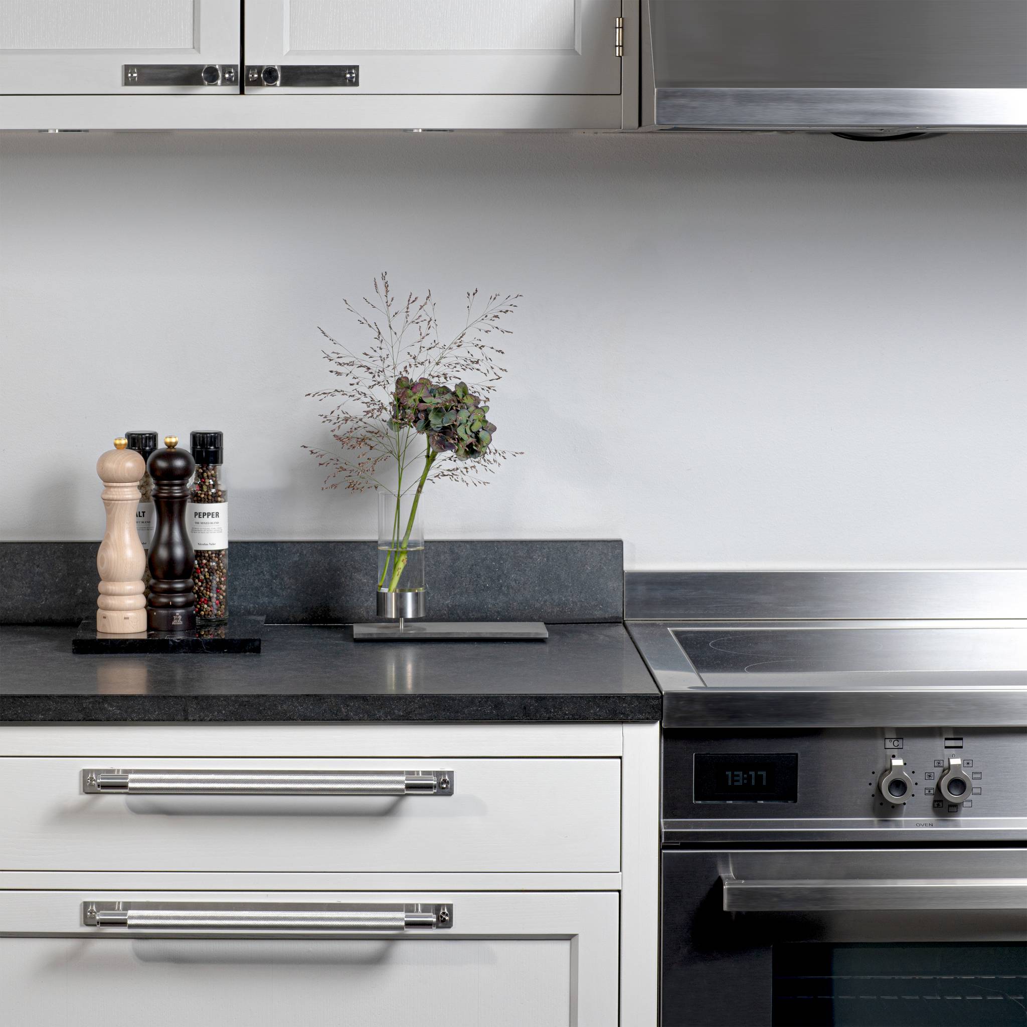 A pull bar made from solid metal in small (160mm / 6.3"), medium (260mm / 10.2") and large (360mm / 14.2") sizes. These pull bars feature our signature, diamond-cut, cross-knurl pattern and is refined by hand. They work great on cabinet doors, wardrobe drawers, cupboards and kitchen units